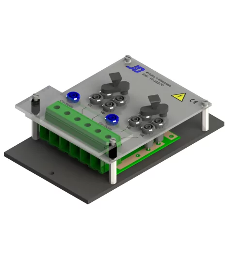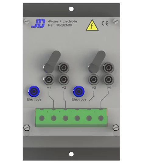Anschlussplatine, die mit zwei (nicht überbrückbaren) Zwei-Kanal-Fenstern mit den Bezeichnungen V1 bis V4 und zwei Elektrodenplätzen ausgestattet ist.