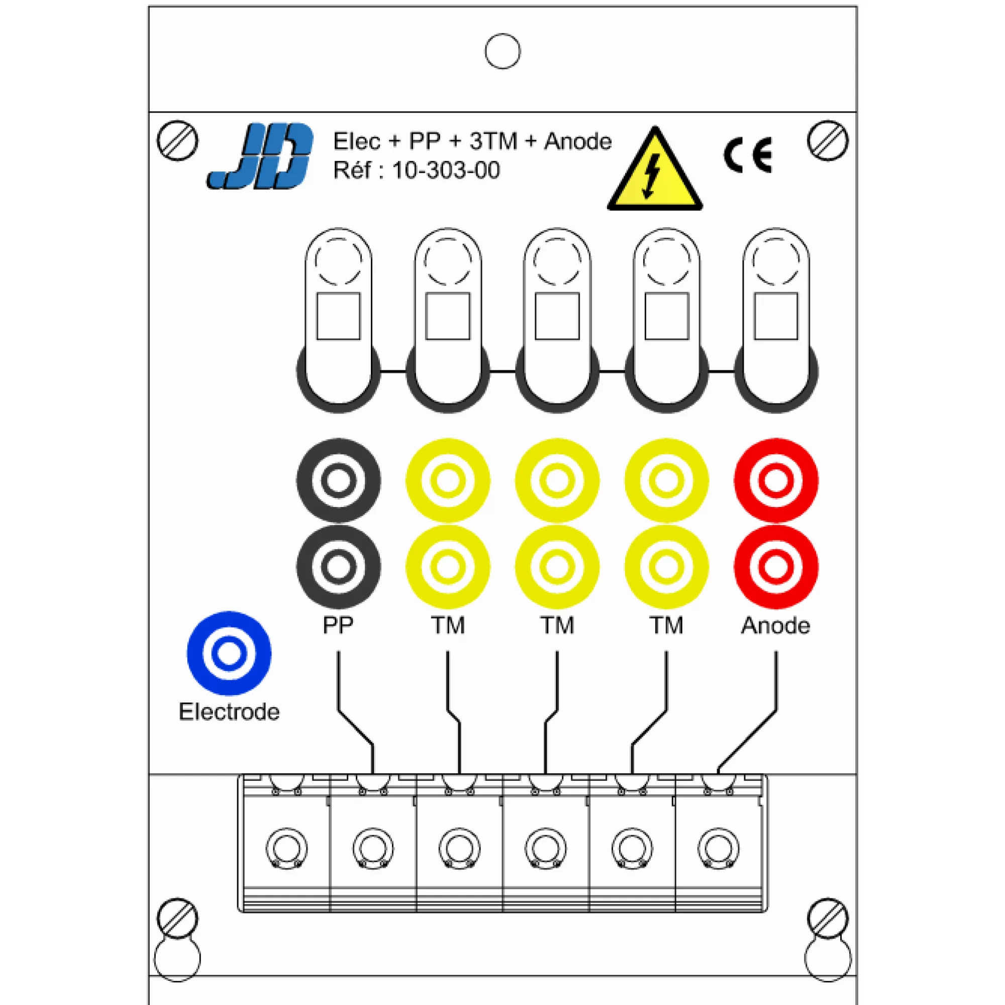 Connection plate with 5 ways identified PP and 3 x TM + ANODE, one electrode connector, and a common electrical path.